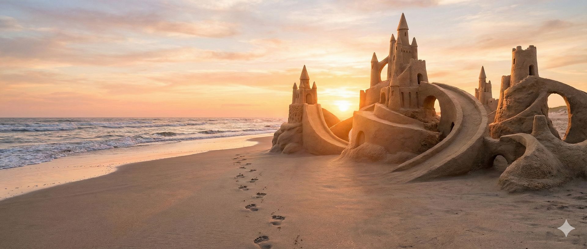 Elaborate sandcastles on beach at sunset showing transformation from sand to creation